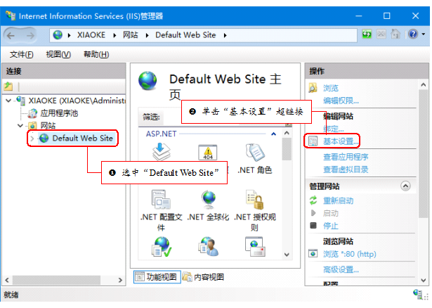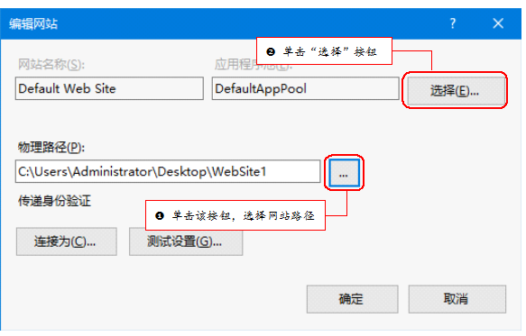 (2)展开网站节点,选中“Default Web Site”节点,在右侧“属性”列表中单击“基本设置”超链接,弹出“编辑网站”对话框,如图2所示。