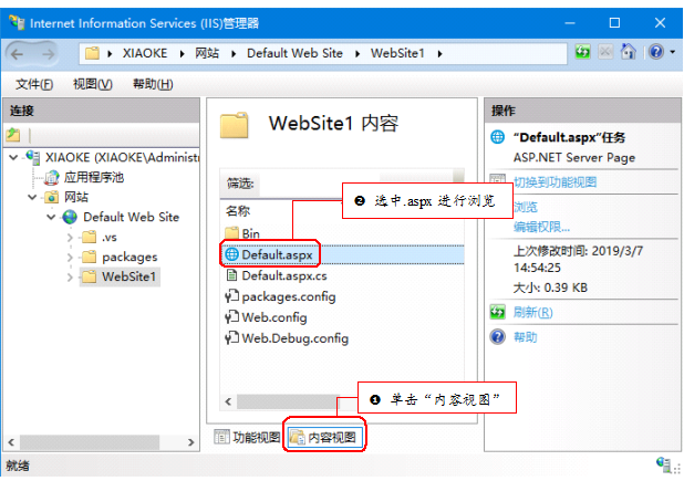 (4)在“Internet信息服务(IIS)管理器”窗口中单击“内容视图”,切换到“内容视图”页面,如图4所示,在该对话框中间的列表中选中要浏览的ASP.NET网页,单击右键,在弹出的快捷菜单中选择“浏览”菜单项,即可浏览选中的ASP.NET网页。
