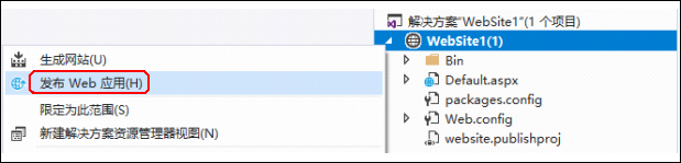 (1)在Visual Studio 2017开发环境的解决方案资源管理器中选中当前网站,单击右键,在弹出的快捷菜单中选择“发布Web应用”选项,如图5所示。