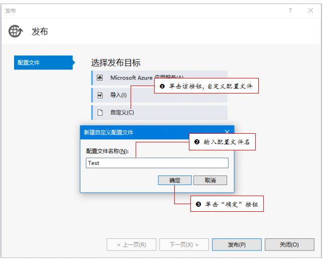 (2)弹出 “发布”对话框,该对话框中单击“自定义”按钮,弹出“新建自定义配置文件”对话框,输入配置文件名称,单击“确定”按钮,如图6所示。