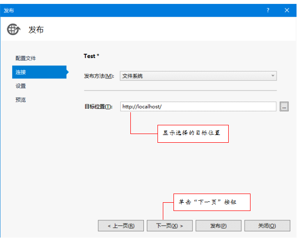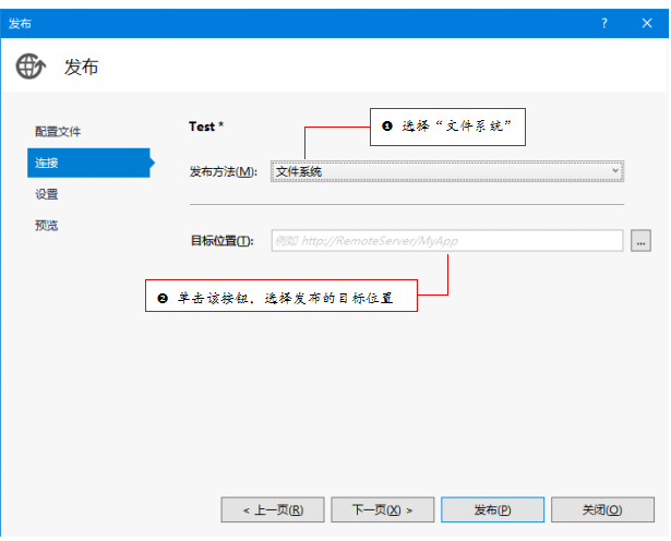 (3)进入“发布――连接”对话框,该对话框中,在“发布方法”下拉列表中选择“文件系统”,单击“目标位置”文本框后面的选择按钮,如图7所示。