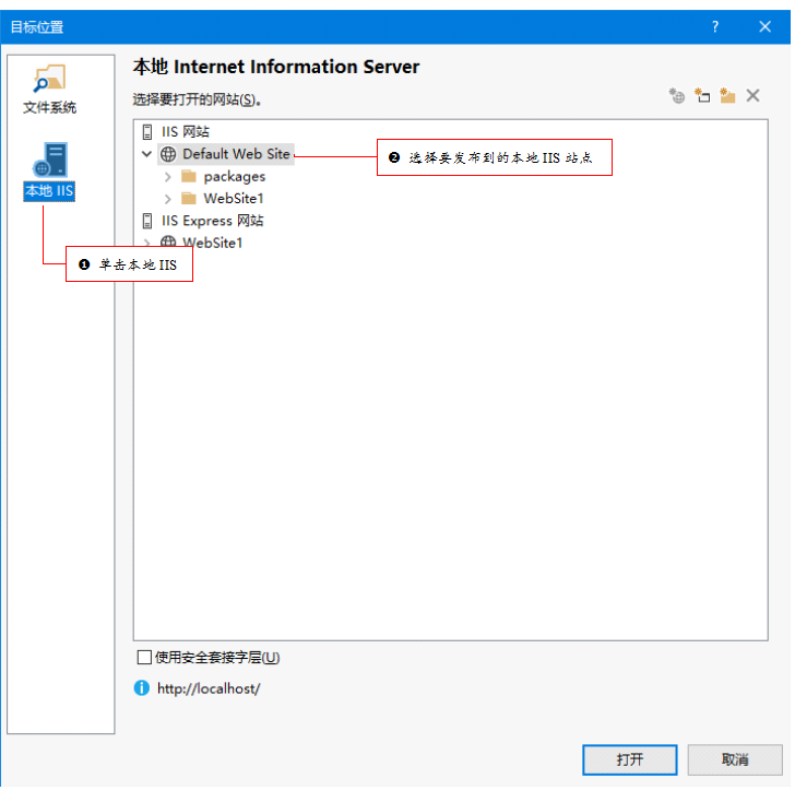 (4)弹出“目标位置”对话框,该对话框中提供了2个网站发布的目标位置,分别是“文件系统”、“本地IIS”,默认为文件系统,单击“本地IIS”按钮,切换到“本地Internet Information Server”,该对话框中可以选择要发布到的本地IIS站点,如图8所示。