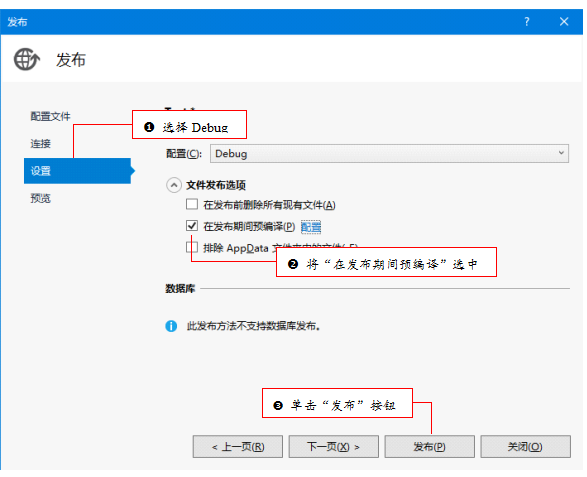 (6)进入“发布――设置”对话框,该对话框中首先将“配置”设置为Debug,然后选中“在发布期间预编译”复选框,单击“发布”按钮即可,如图10所示。