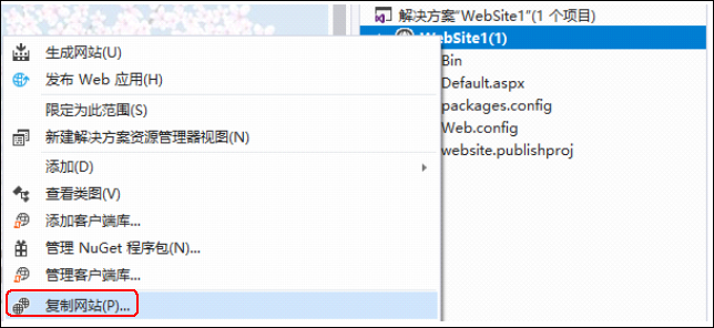 (1)在Visual Studio 2017开发环境的解决方案资源管理器中选中当前网站,单击右键,在弹出的快捷菜单中选择“复制网站”选项,如图13所示。