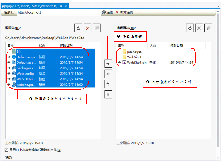 说明:使用“发布Web应用”功能发布ASP.NET网站时,代码文件都被编译成了dll文件,保证了网站的安全性;而使用“复制网站”功能发布ASP.NET网站时,只是把网站文件简单复制到了指定的站点。因此,在实际发布网站时,推荐使用“发布网站”功能发布ASP.NET网站。